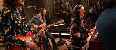 the cast of Stereophonic on stage during a Broadway performance of the play in 2024